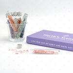 Töltse az üvegekbe és fokozza kedvenc illóolaj keverékét ezekkel a gyönyörű, sima, csiszolt féldrágakövekkel és kristálycsipkékkel. Ez a 10 különböző csiszolt forgácsból álló készlet, különálló üvegampullákban található, hogy szétoszthassa néhány görgős üveg vagy spray palack között, egy gyönyörű dobozba csomagolva, hogy az összes kedvenc drágakőforgácsait tárolhassa!