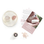 A készlet 3 db Rózsakvarc drágakő-görgőfejet és 3 db angol nyelvű információs kártyát tartalmaz. A kártyák bemutatják, milyen érzelmi és jóléti területeken szokás használni a Rózsakvarcot, és ötleteket adnak az illóolajok párosításához is.