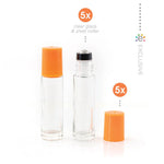 Tartalom: 5 darab 10ml-es átlátszó üveghenger, mandarin (narancssárga) kupakkal és új stílusú rozsdamentes acélgolyóval.