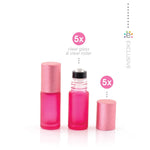 Tartalom: 5 darab pink matt Deluxe görgős Roll-on üvegpalackok, prémium rozsdamentes acél görgők és metál rózsaszín fémkupakok.