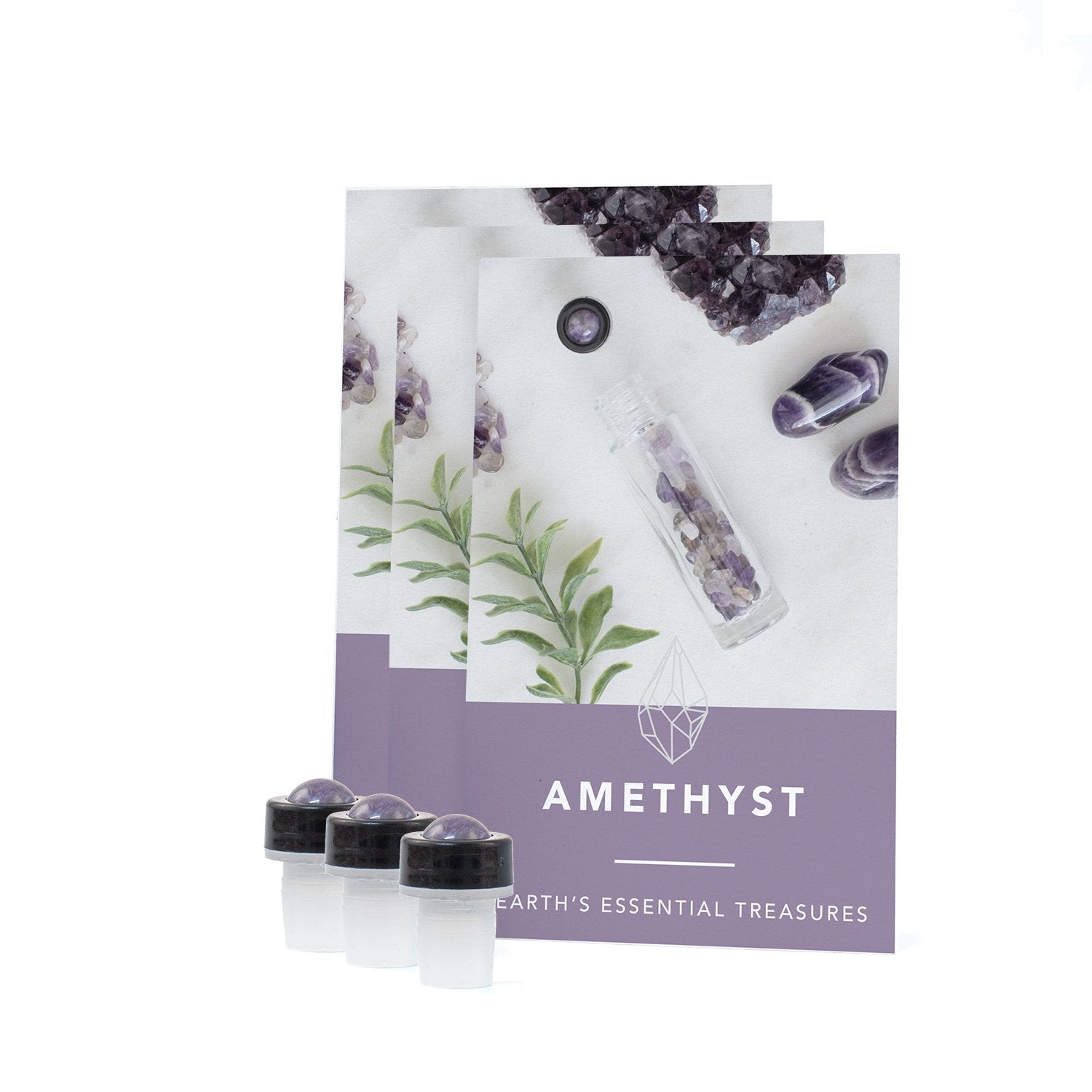 A készlet 3 db Ametiszt drágakő-görgőfejet és 3 db angol nyelvű információs kártyát tartalmaz. A kártyák bemutatják, milyen érzelmi és jóléti területekhez szokták társítani az ametisztet, valamint ötleteket adnak az illóolajokkal való együtt használathoz is.