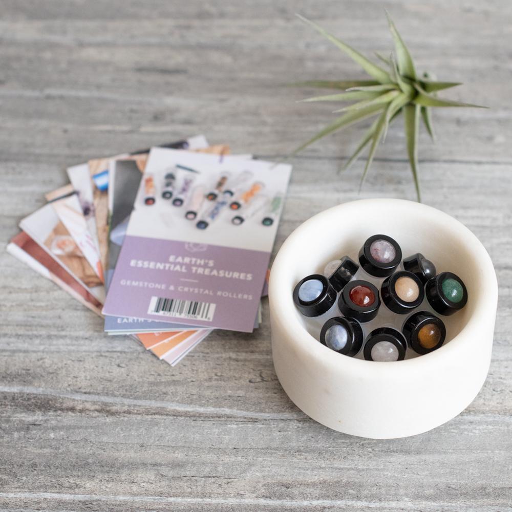 Ezek a kézzel készített drágaköves golyócskák tökéletes kiegészítői lehetnek a személyre szabott illóolaj-gyűjteményének. Amikor a drágakövek és az illóolajok a felhasználó személyes energiamezejével kombinálódnak, harmonizálnak és szinkronizálódnak, hogy magas frekvenciát hozzanak létre, ami olyan szintre emelheti a test frekvenciáját, amely gyógyító és wellness előnyökkel járhat. A magas energetikai frekvenciák tökéletes álapotot biztosítanak a test számára, hogy elhárítsa a rossz közérzetet és a betegségeket. A görgőkkel együtt ez a készlet egyedi oktató kártyákat is tartalmaz, minden drágakőhöz egyet, amelyek részletezik azokat a wellness és érzelmileg támogató területeket, amelyeket ezek a drágakövek támogathatnak, a használatukhoz javasolt illóolajokkal együtt.