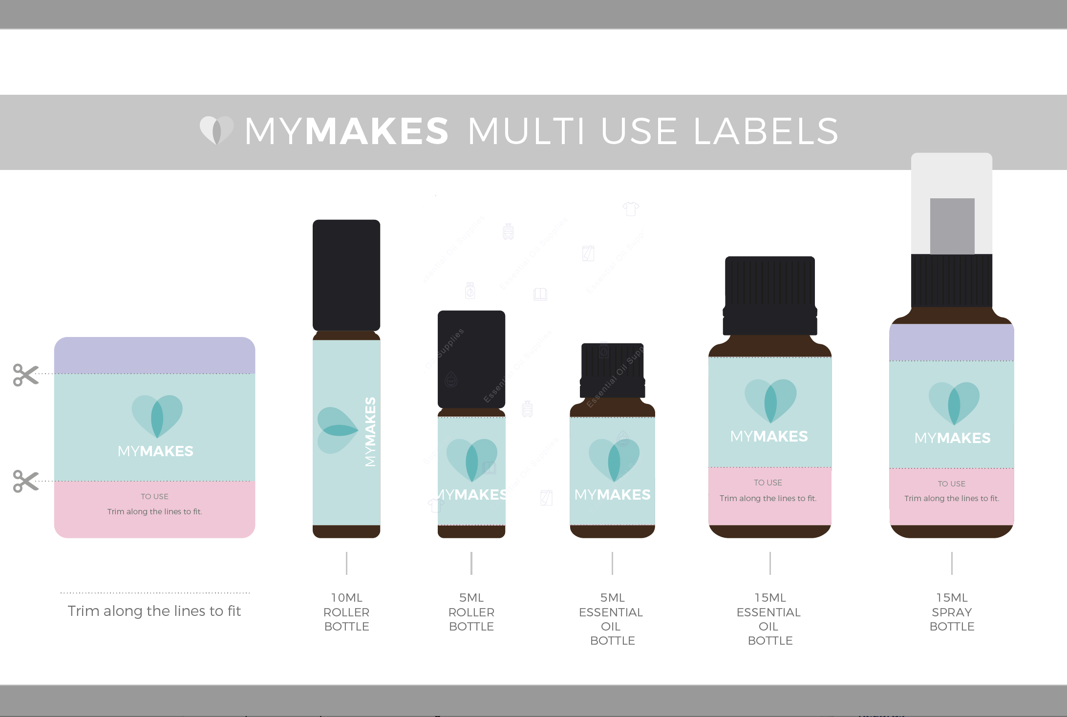 Egyedülálló, többféle üvegcséhez használható címkét hoztunk létre, amelyet egyszerűen használhat a prospektusban javasoltak szerint, vagy az Ön által választott alternatív méretű üvegeken, mikor személyre szabja és testreszabja az igényeinek megfelelően. Lehet, hogy egy kisebb méretű palackot szeretne készíteni mintaként vagy szobai spray-ként. A címkék ollóval levághatók, hogy különféle palackokhoz illeszkedjenek, ahogy az ábrán és a címkelapon feltüntettük azt.