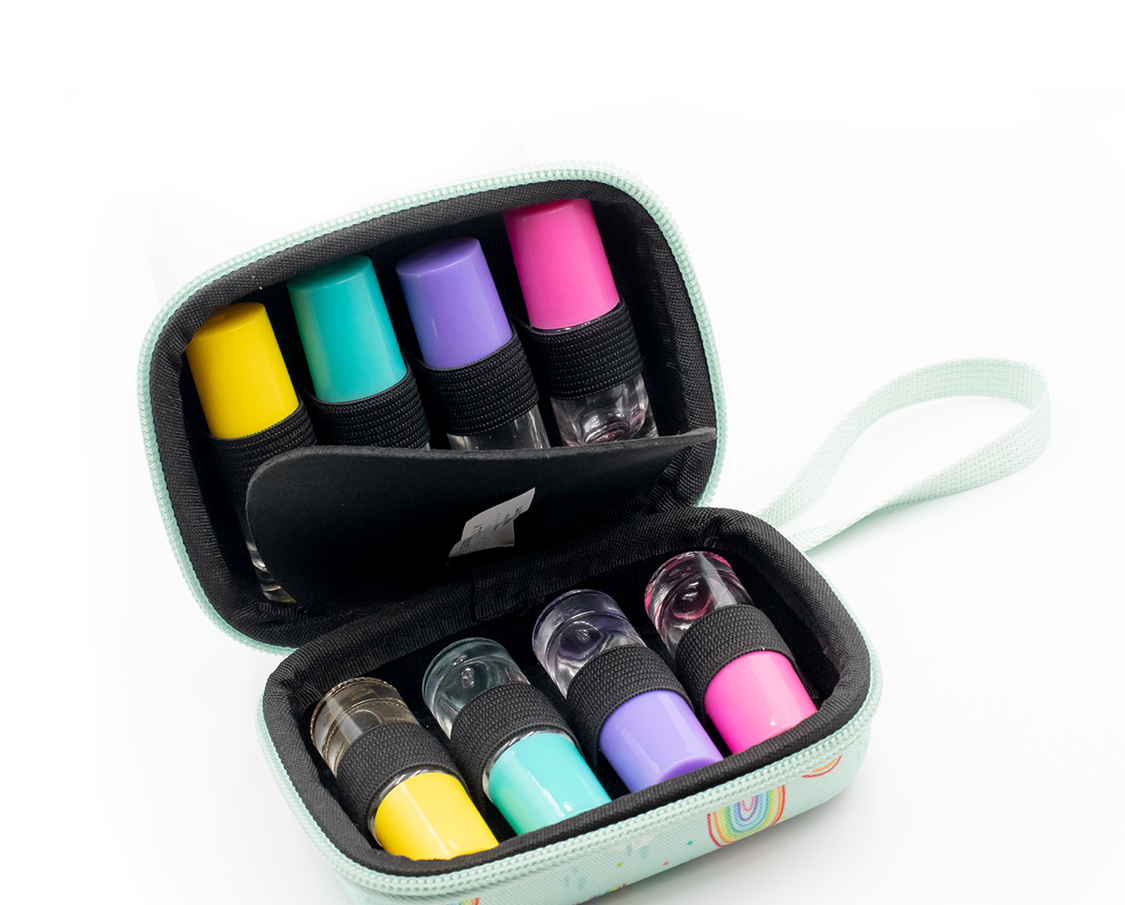 Ez a kemény héjú hordtáska prémium minőségű anyagokból készült, hogy biztosítsa az értékes "aranycseppek" biztonságos szállítását és védelmét. Tökéletes méretének köszönhetően, 8 db 5 ml-es görgős üvegcsék befogadására képes, amelyek az Ön által preferált, támogató keverékeket tartalmazzák a nap folyamán, valamint egy színben hozzá illő csuklópántot, amely megkönnyíti a tartást, ha útközben kell kivenni egy üvegcsét, vagy ha egy gyermeknek kell könnyedén szállítani.