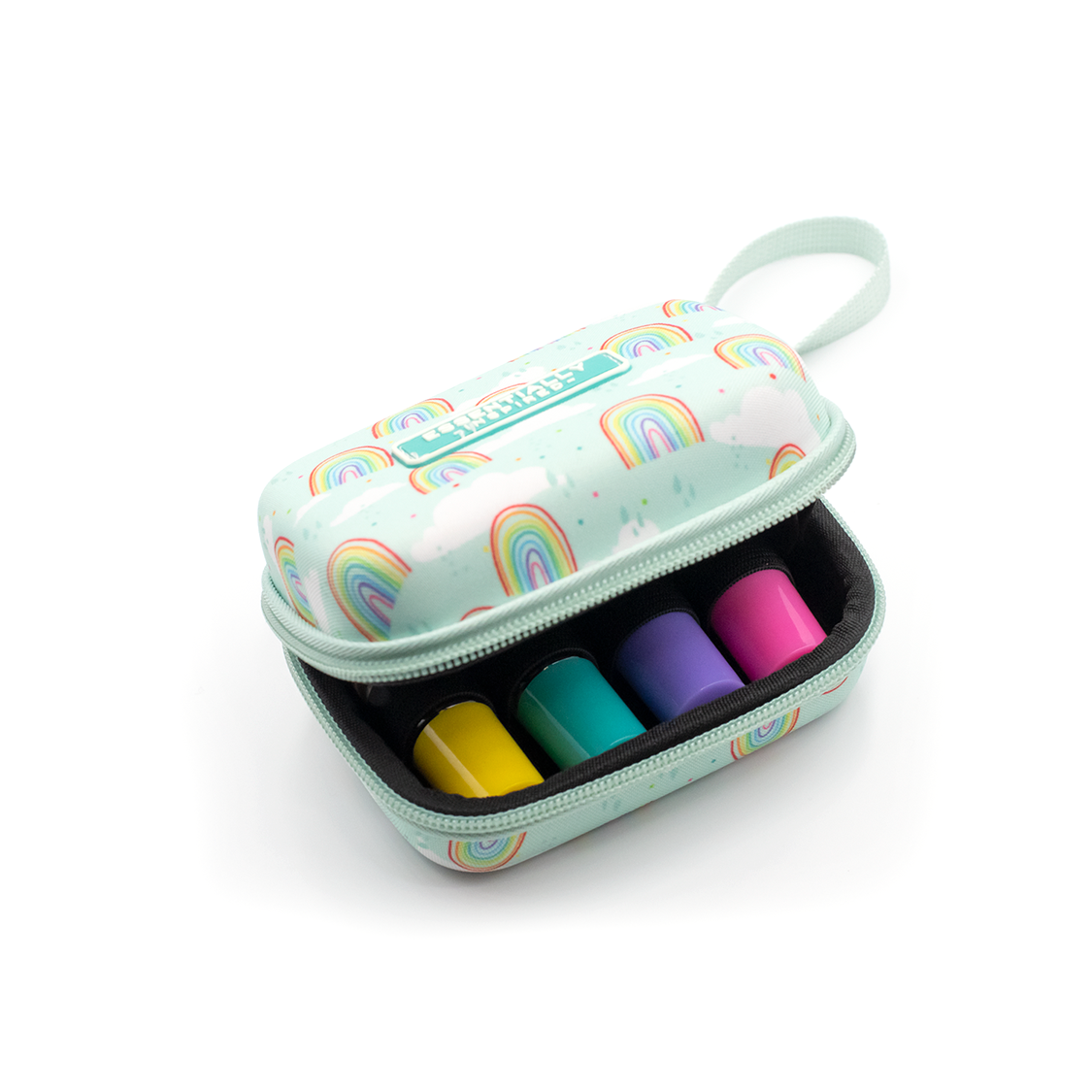 Ez a vagány, világos, gyermekbarát kialakítású tok a hozzá illő kupakos görgős üvegekkel tökéletes kiegészítője a MyMakes termékeinknek: Mega Kidz készletünknek, amely számos, kifejezetten gyermekek számára készült receptkeveréket tartalmaz. Adjon a gyerekeknek egy szórakoztató módot arra, hogy ezzel a készlettel elkezdjék az illóolajok használatát. Tekintse meg, Mega Kidz kemény héjú olajtáskánkat is, melyhez tartozi 10 darab 5 ml-es görgős üveg, színes kupakokkal.